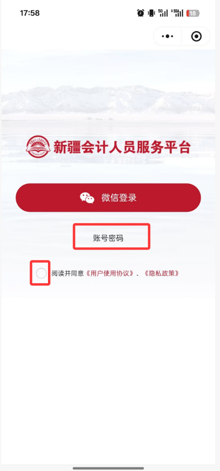 4. 勾选“阅读并同意《用户使用协议》、《隐私政策》”,点击“账号密码”;