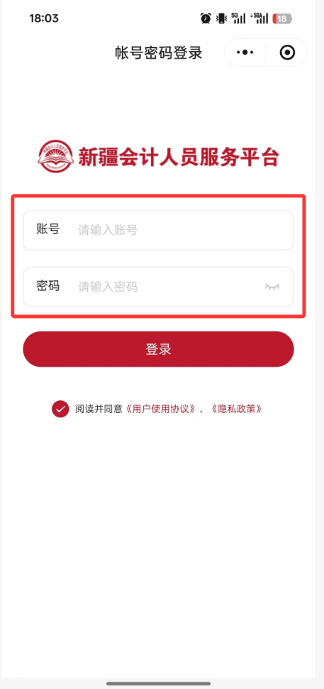 5. 输入新疆会计人员平台的账号(身份证号)和密码,点击“登录”;